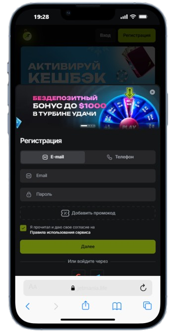 Перейдите на главную страницу портала Jetton казино и кликните на заметную кнопку «Регистрация» в правом верхнем углу экрана. Заполните 2 обязательных поля в появившейся форме, указав актуальный e-mail или телефон для связи. Выберите одну из 10 доступных валют для вашего счета и подтвердите согласие с правилами сервиса Jetton казино галочкой. Завершите процесс нажатием финальной кнопки, после чего доступ ко всем играм и бонусам будет открыт. |